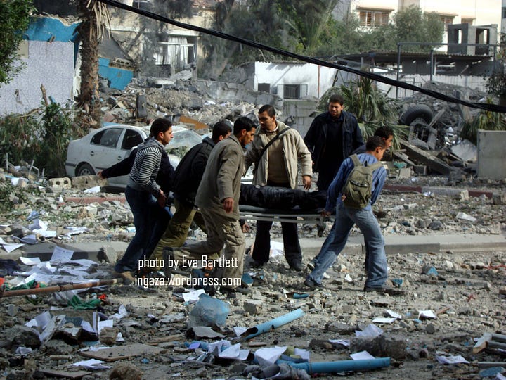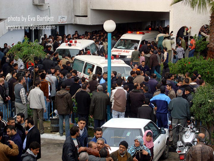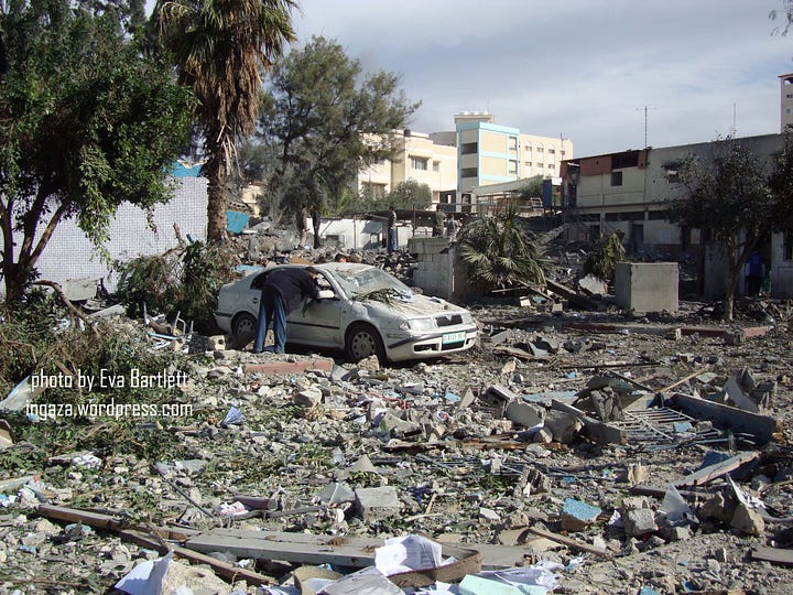 I was in Gaza at the time and saw the immediate aftermath of the initial bombings, the chaos and destruction in every direction. Shifa hospital, Gaza’s main hospital, was an endless circuit of cars and ambulances bringing the dead and injured.