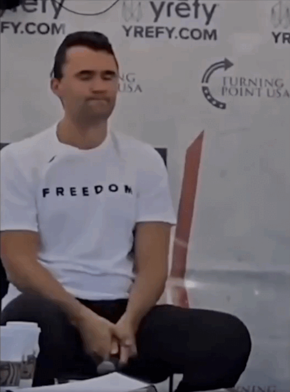 So let’s get into the main arguments of the fake death. They rely on a careful viewing of the footages of Kirk’s “death”. Most videos about the event will avoid showing the blood, but since we are examining here the possibility that it is fake blood, it is necessary to get a very close look at it. This footage, filmed from the front, is the most important. We’ll get back to it.